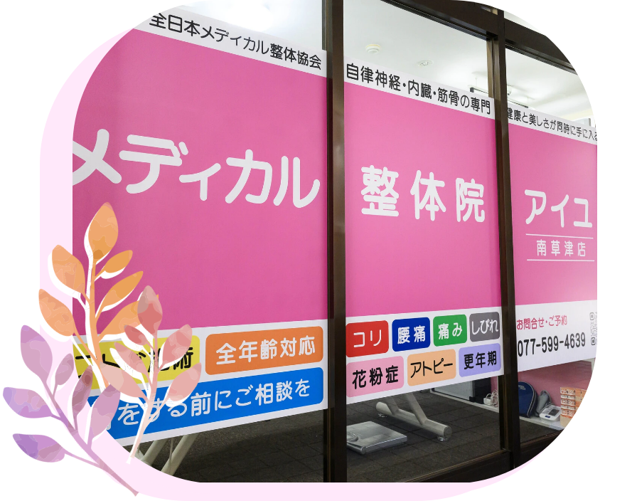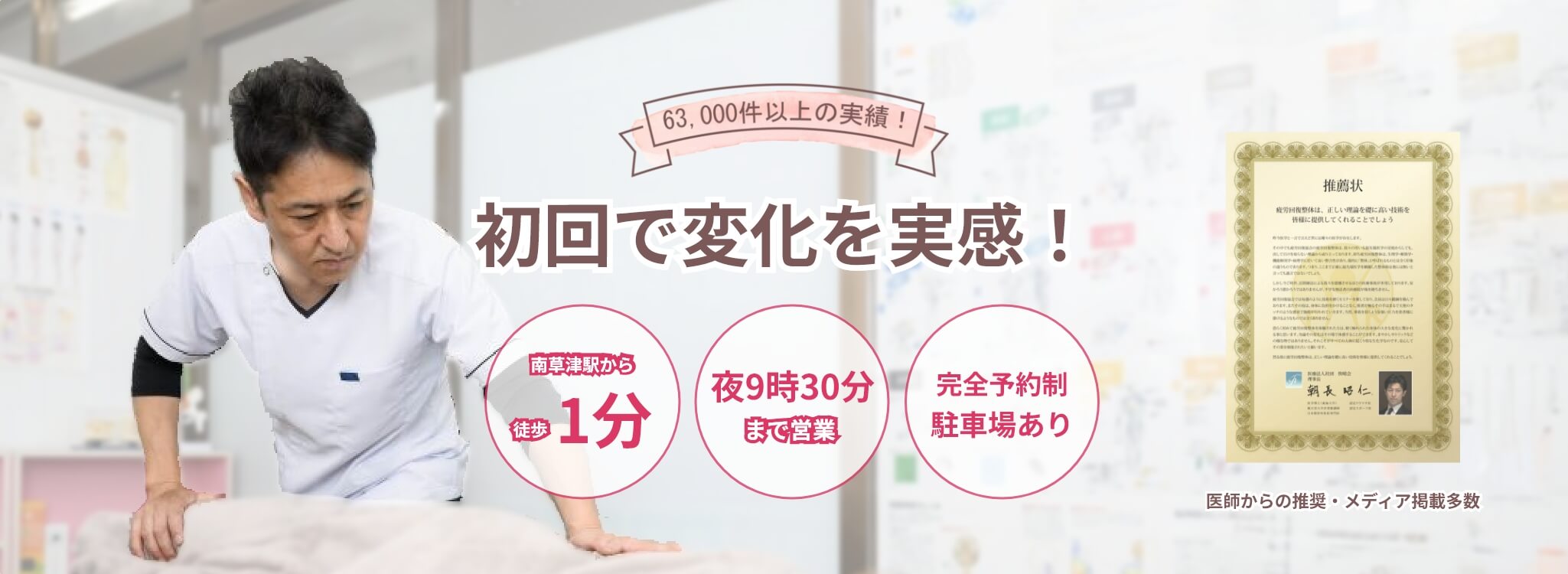 実は私自身が辛い痛みとシビレで治療院めぐりをして苦しんだ経験から、『何年も治らないつらい症状や、病院や接骨院、また鍼灸やマッサージに通っても治らずに悩んでいる人を1人でも多く助けたい』という思いで南草津で開院しました。